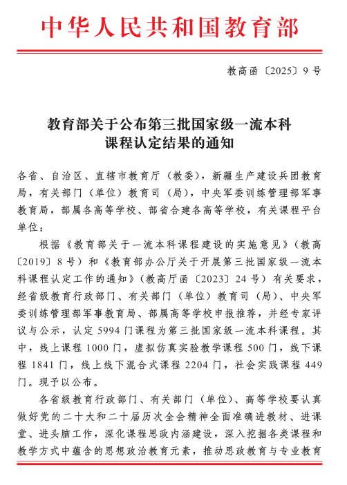 国家级一流本科课程建设是教育部深化新时代本科教育教学改革、全面提高人才培养质量的重要举措,重点聚焦课程的高阶性、创新性与挑战度,旨在打造一批具有示范引领作用的优质课程资源。