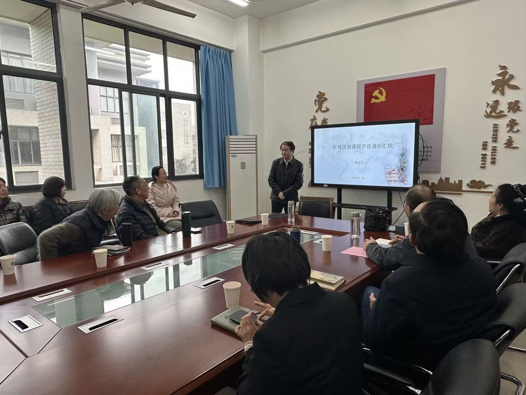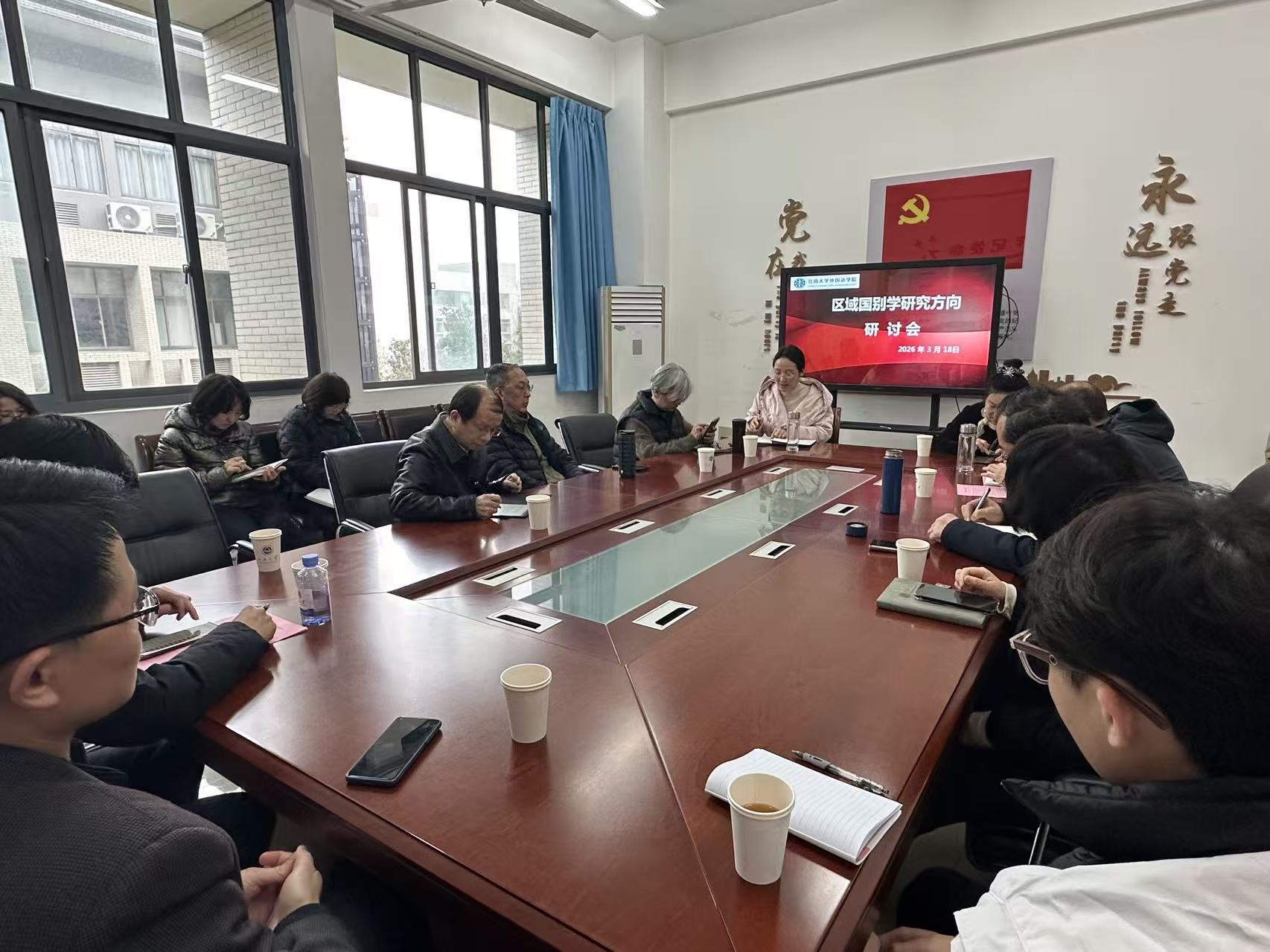为对接国家战略需求,助力外语学科高质量发展,2026年3月18日下午,江南大学外国语学院召开了“区域国别学专题研讨会”。本次研讨会聚焦“区域国别学研究”这一核心议题。会议由谢竞贤副院长主持,外国语学院党委书记李荣华、院长方文开,副院长顾琦一、杨勇,MTI主任李学宁及学院11位专家共同参加了本次研讨,大家围绕议题展开了多维度、深层次的探讨。