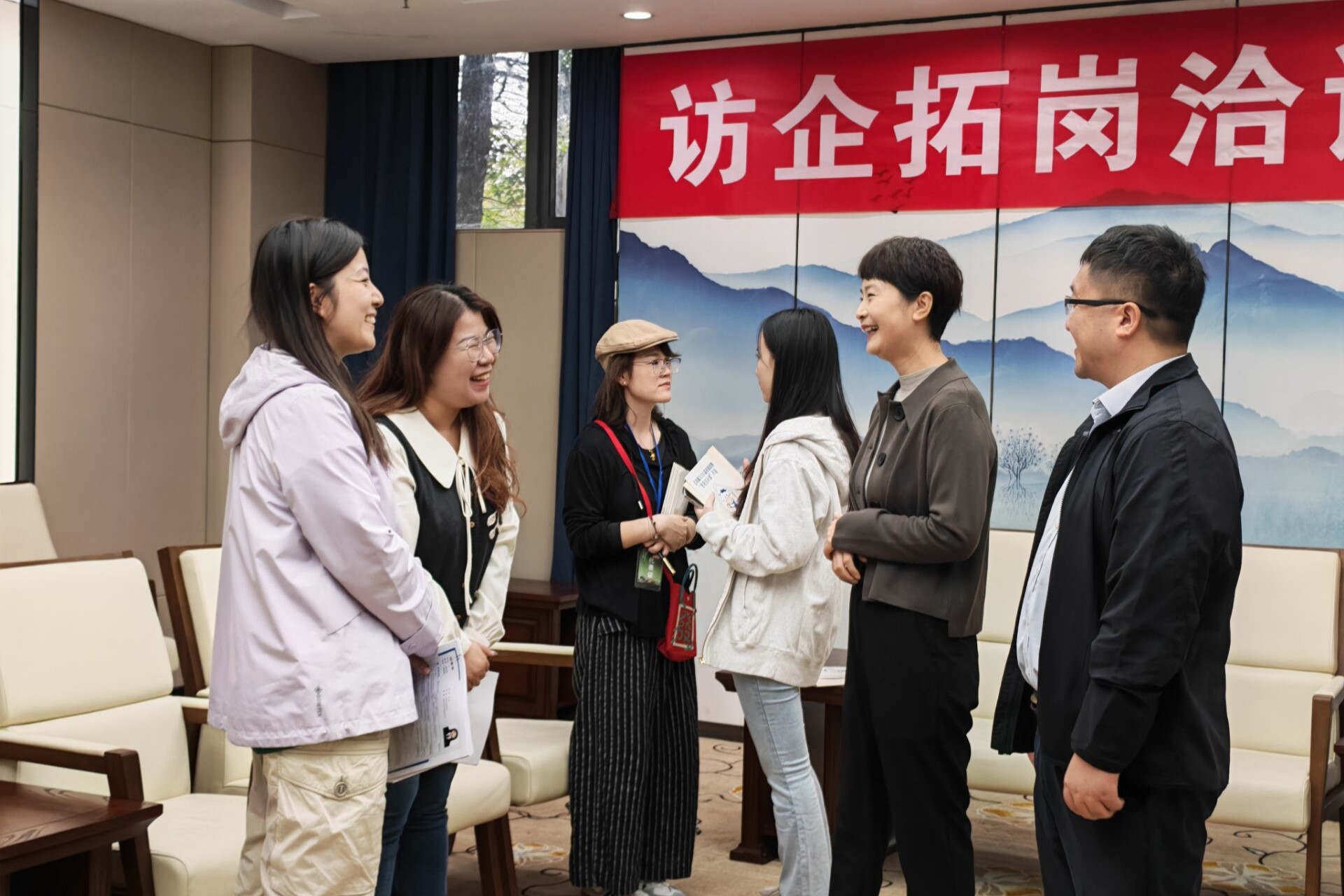 招聘会当天,外国语学院党委书记李荣华,党委副书记、副院长季王飞,班主任许兰娟、李建及辅导员朱家烨深入会场,化身“求职推荐官”,重点走访苏美达、江苏国泰等25家企业,详细介绍学院专业设置、人才培养特色及2026届毕业生情况,并将55份学生简历亲自递交给相关用人单位。此外,学院还精心准备了包含生源信息的“能量包”,助力企业更全面了解外院学子。